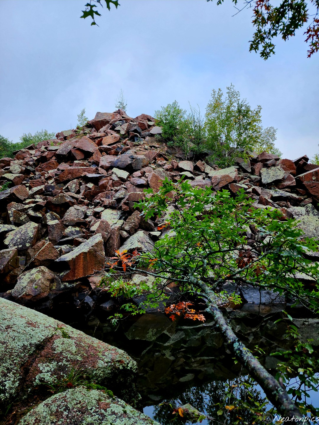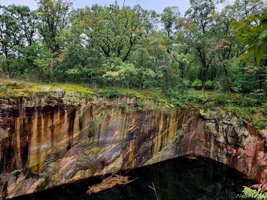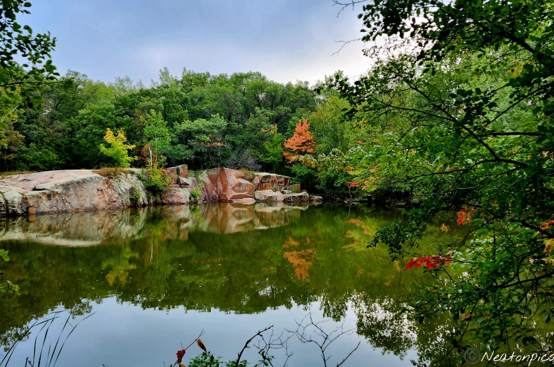 Ah, the crisp fall air felt wonderful as we began our hike into the park. There are many different unpaved trails throughout the park that weave around the 20 different quarries. Saint Cloud Red Granite was quarried from the land with operations ending in the mid 1950’s. Quarry Park and Nature Preserve opened in 1998. Along with hiking, biking and skiing, people are able to swim, SCUBA dive and rock climb in designated areas.