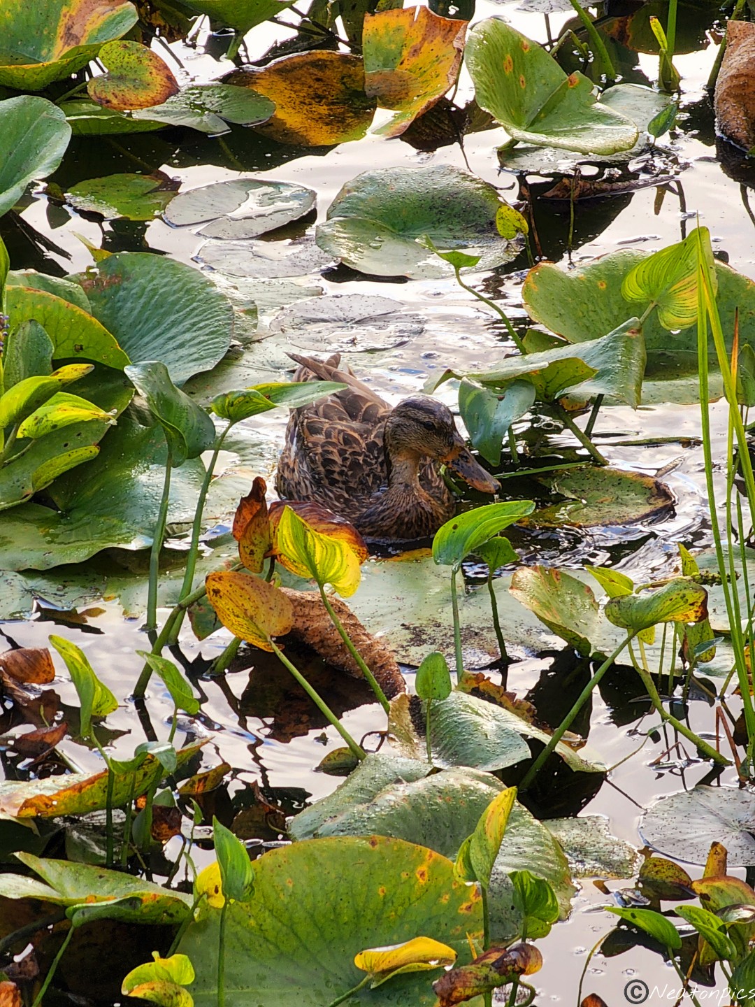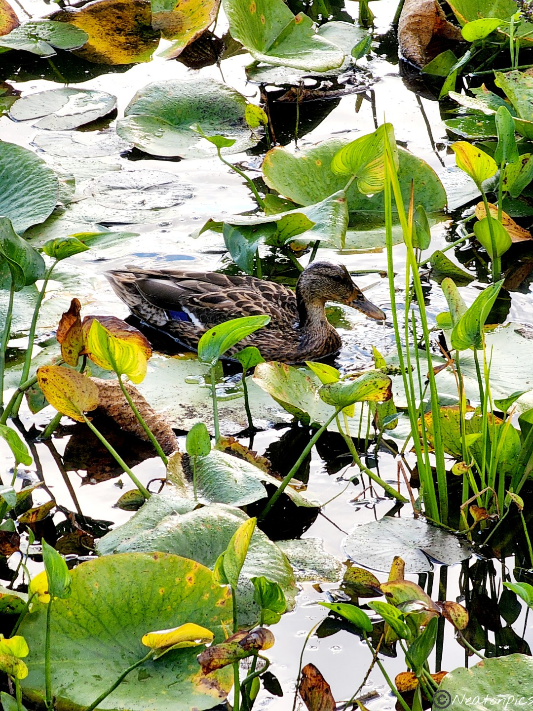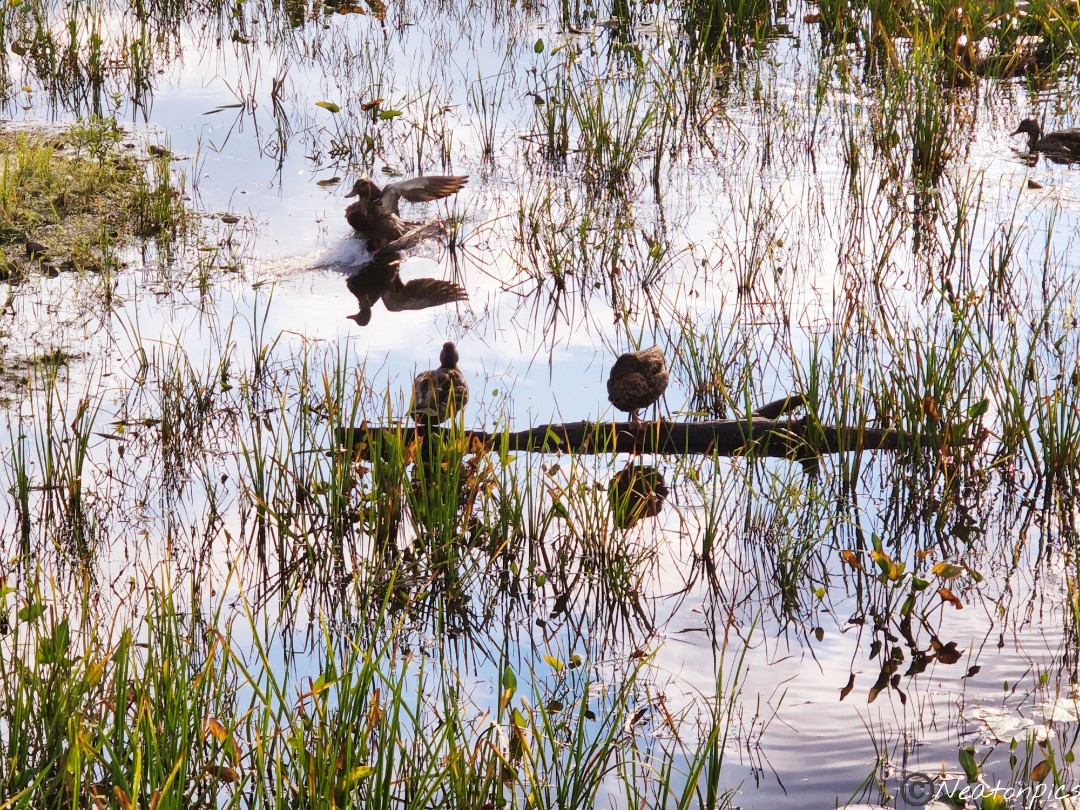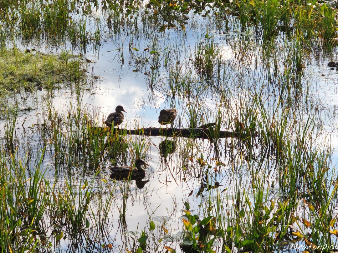 While crossing the wooden planks, a family of ducks swam past us.