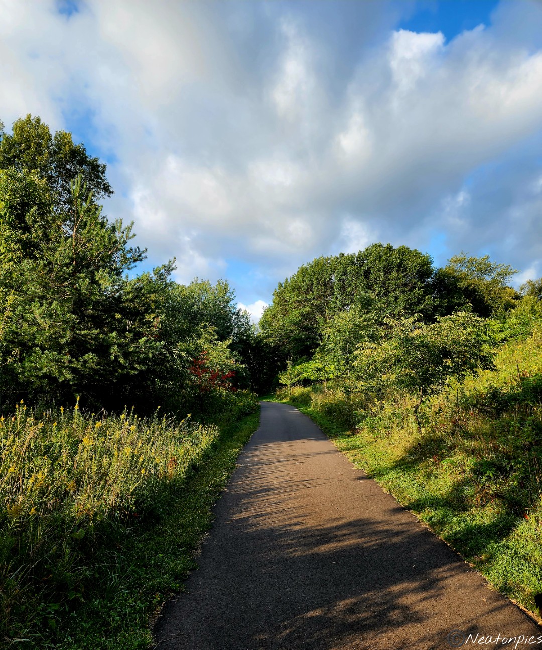 A wide paved trail looped around the Purgatory Creek Wildlife Area.