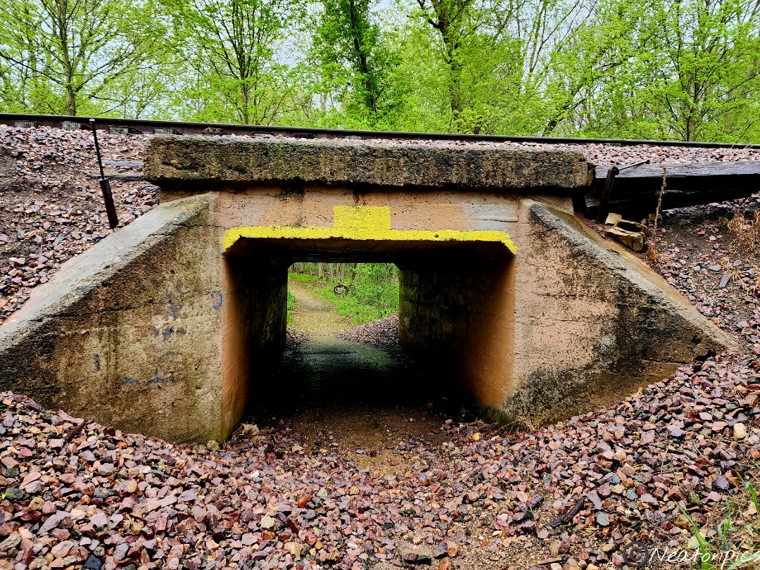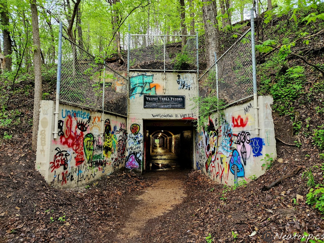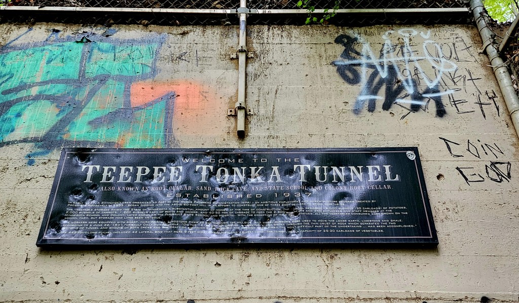 The trail led to a tunnel. It was called the Teepee Tonka Tunnel. The sign stated it was established in 1937 as an old root cellar. Of course, we had to go through it.
