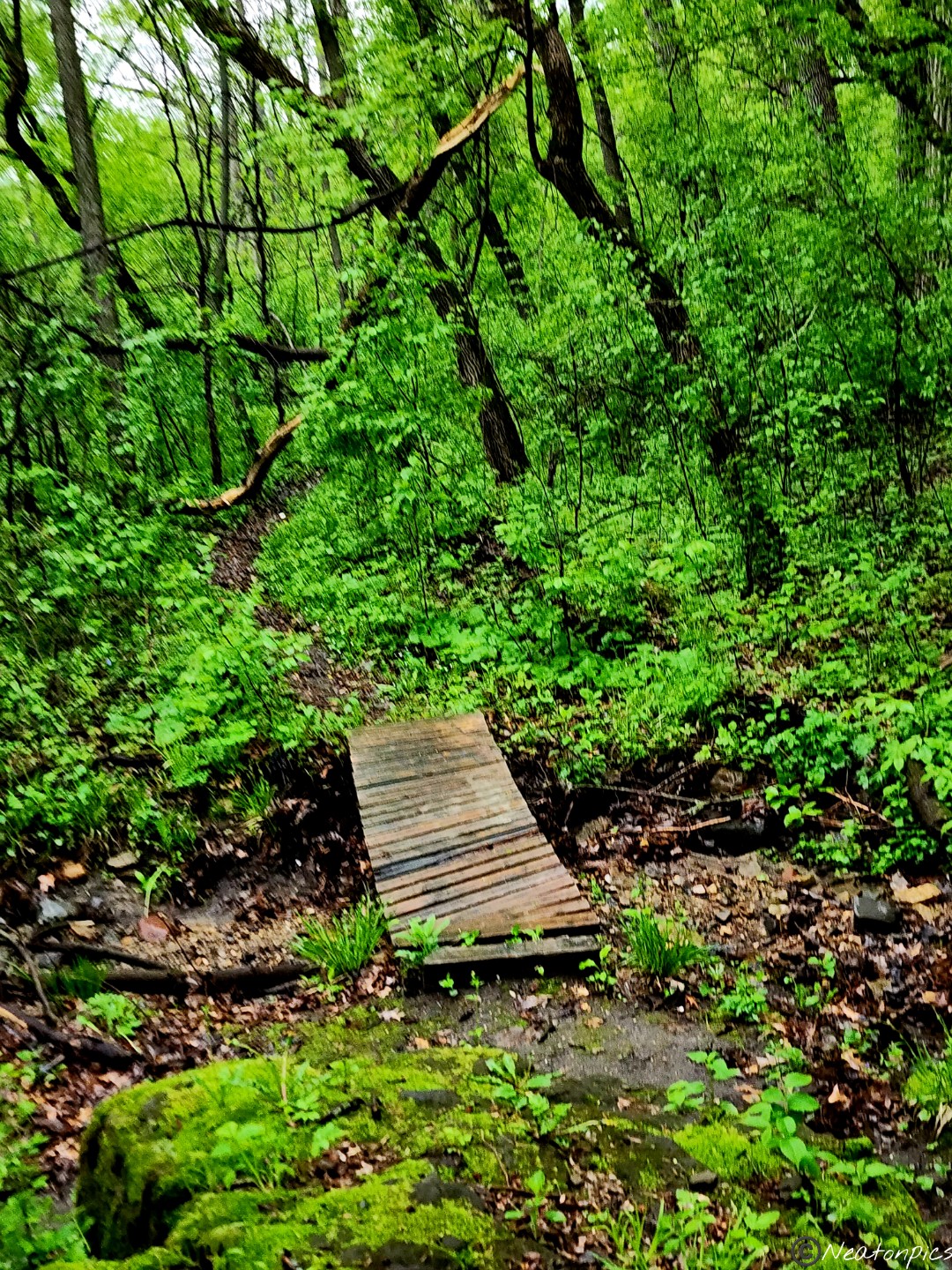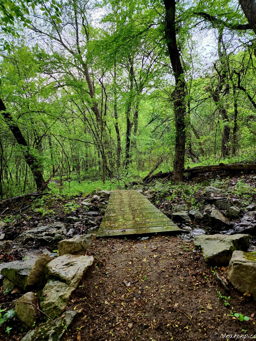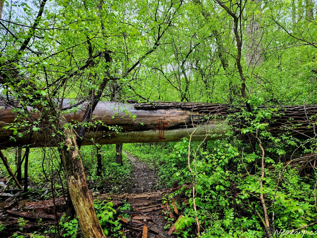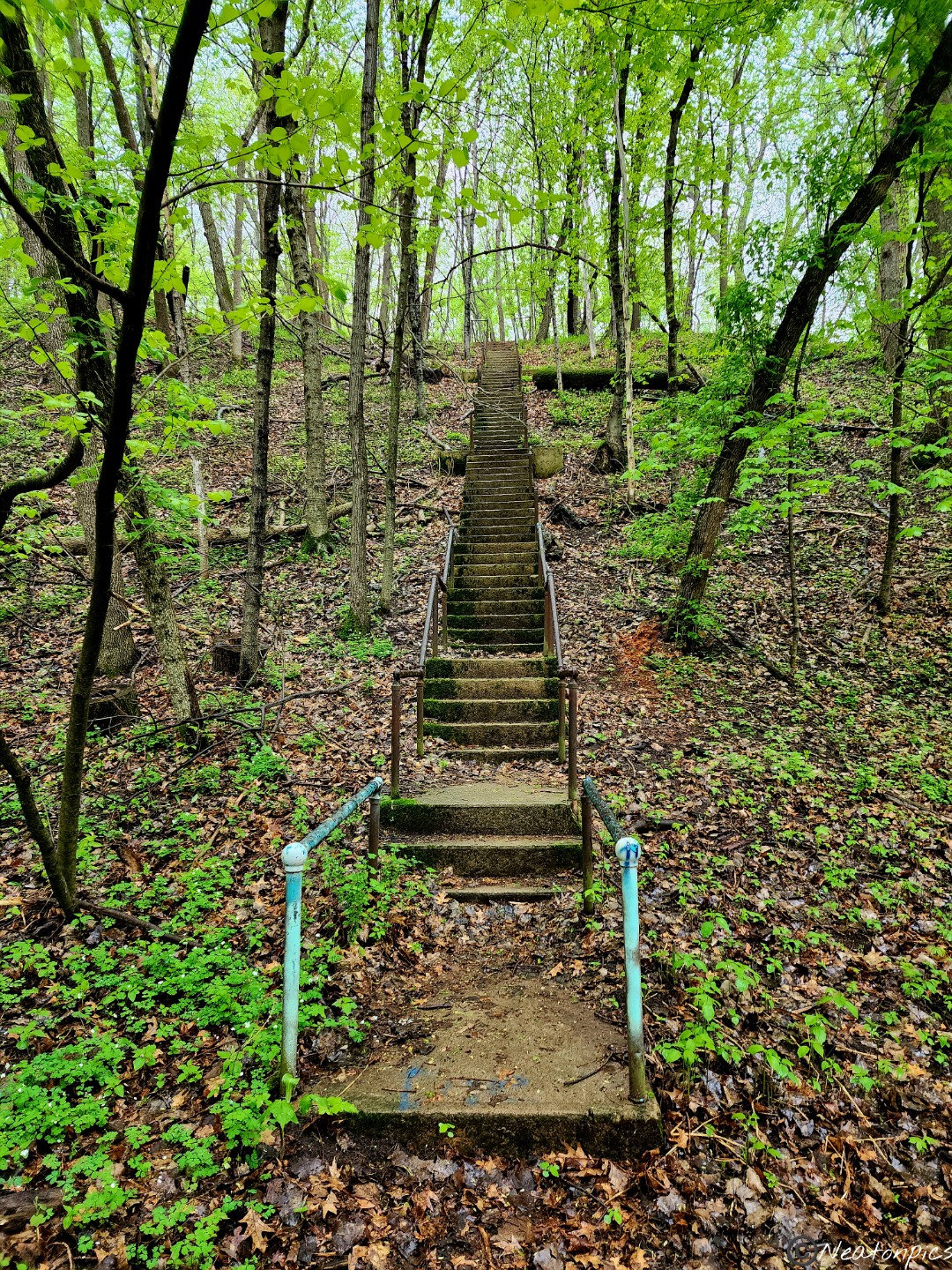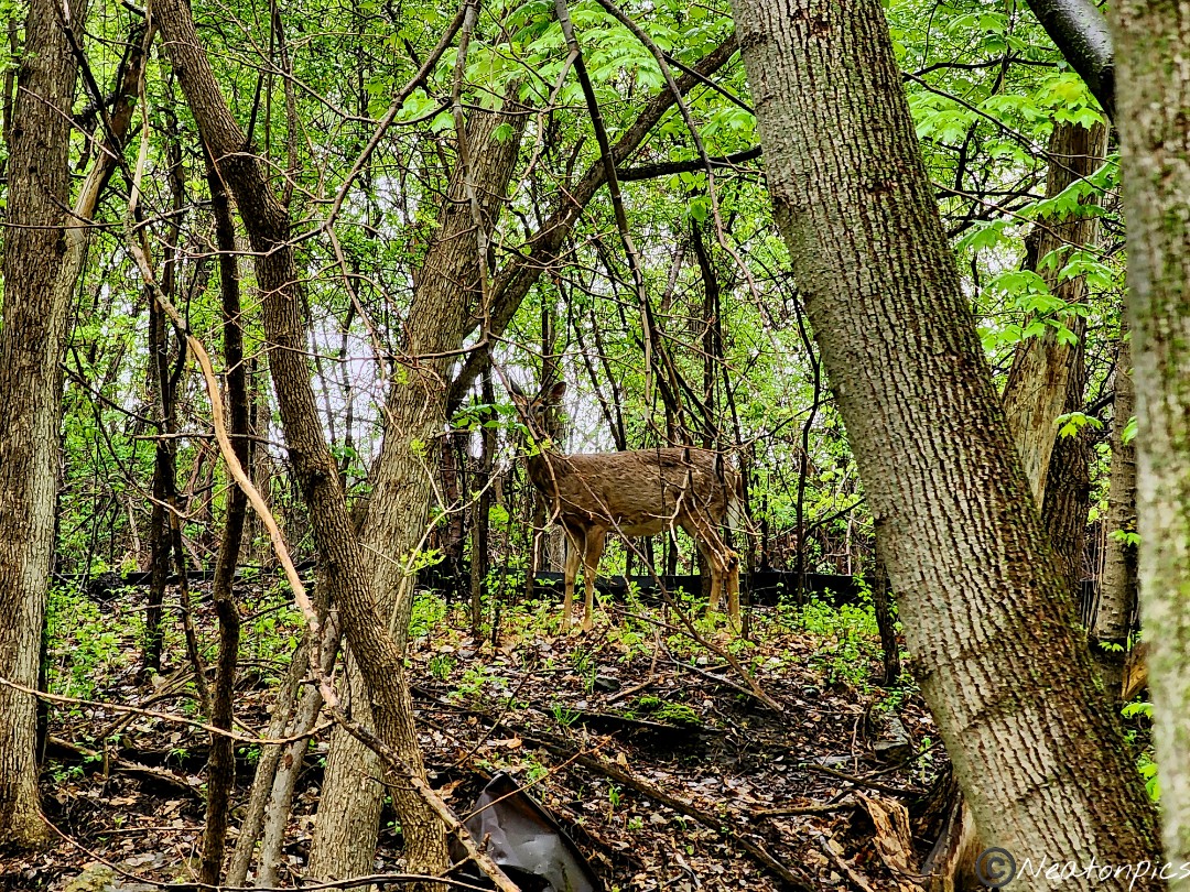 We looped around the park and it brought us back to where the lone goose was hanging out on the train bridge. And yes, the goose was still there. We found a tall set of stairs and decided to see what lay atop of the hill. We spotted deer at the top. We could not locate any trails, so back down the steps we went.