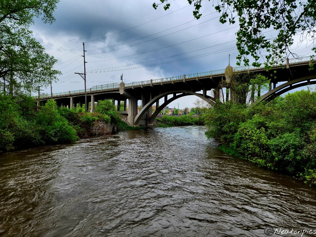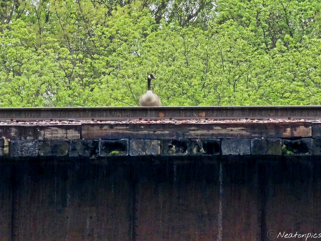 We stopped on the bridge that crosses over the Straight River. Trains crossed over the bridge in the distance. A lone goose sat on the bridge watching the rushing river below.