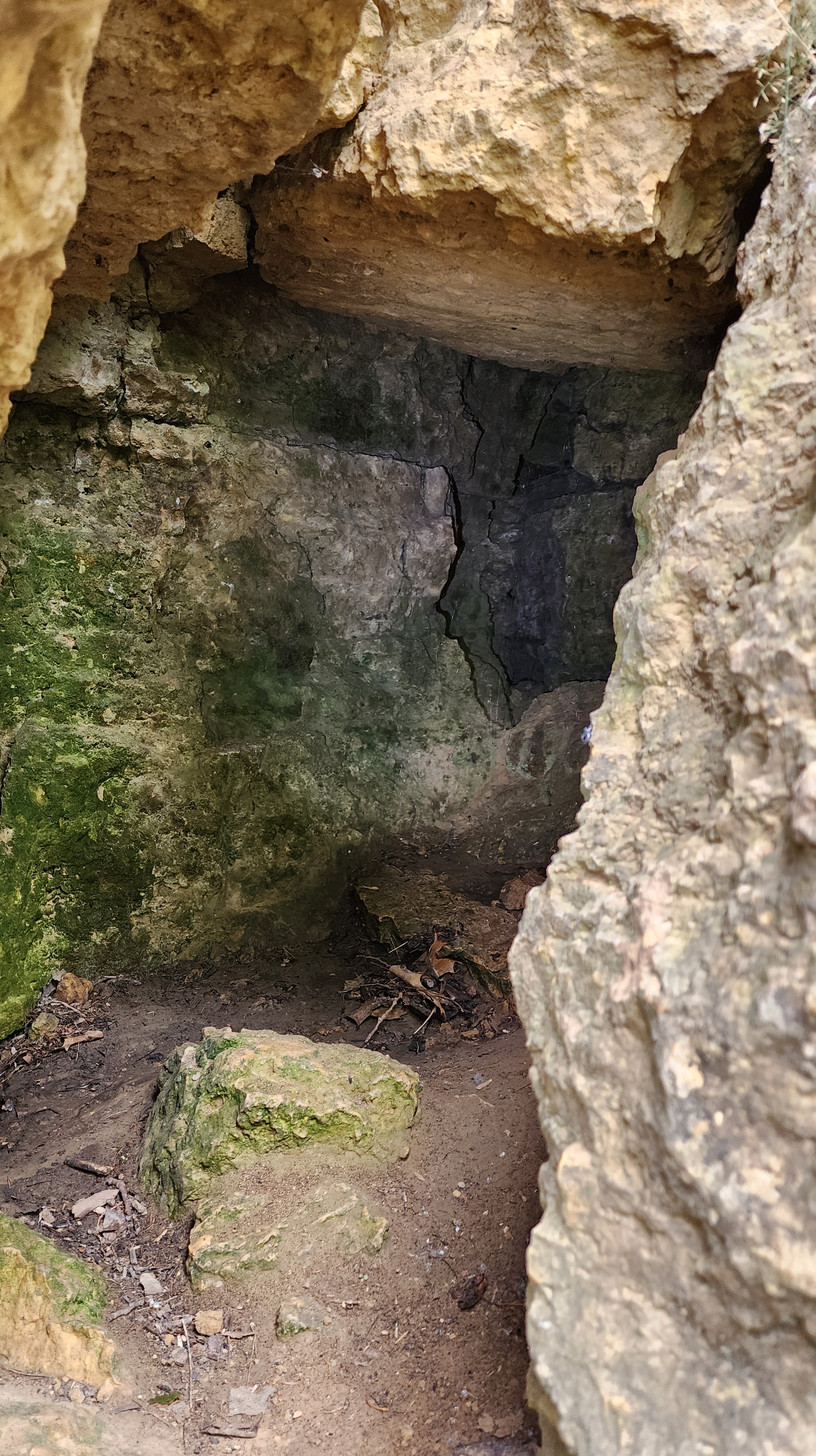 Mid-way along the road, a staircase appeared to our right. Of course we had to see what was at the top. A cave! The cave entrance was a bit too tight for comfort, so after a few photos we hiked on.