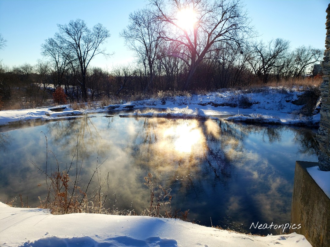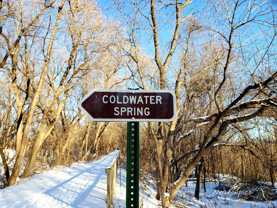 Coldwater Spring was the first site. The creek was lightly flowing with snow and ice surrounding the edges. The rising steam from the water shimmered through the rising sun. The old Coldwater Spring house and reservoir is a beautiful place to visit during the winter months.