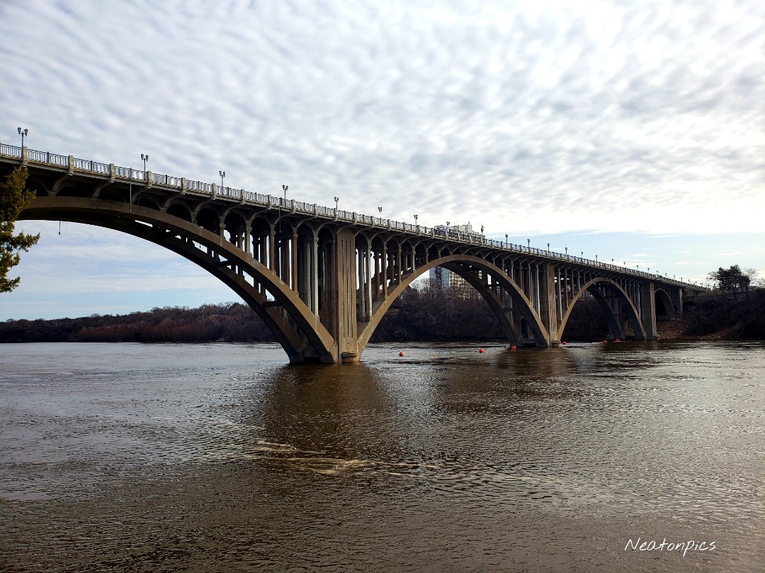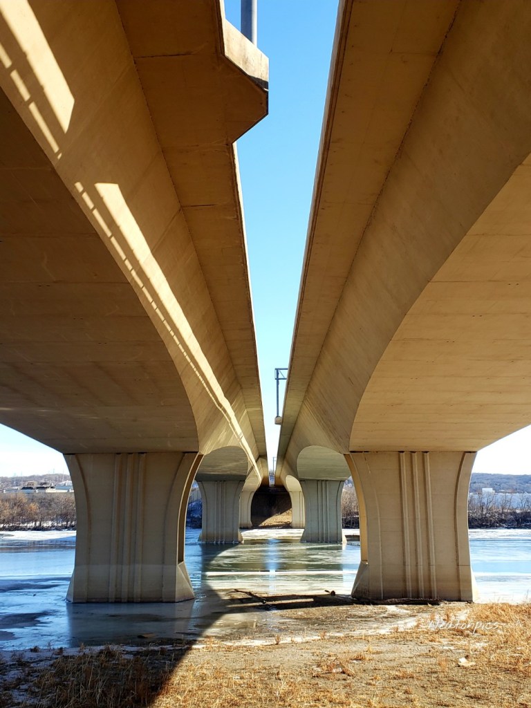 The trail went under the Wakota Bridge. I had to wait for a long train to pass by before I could make my way towards the top of the bridge.