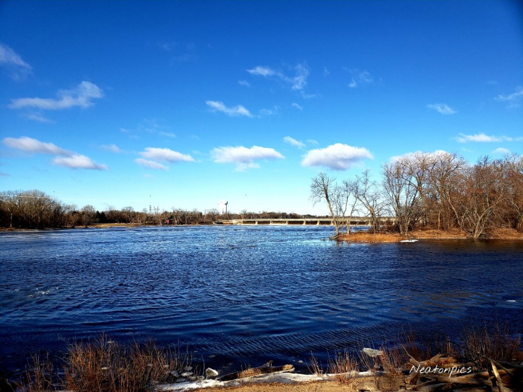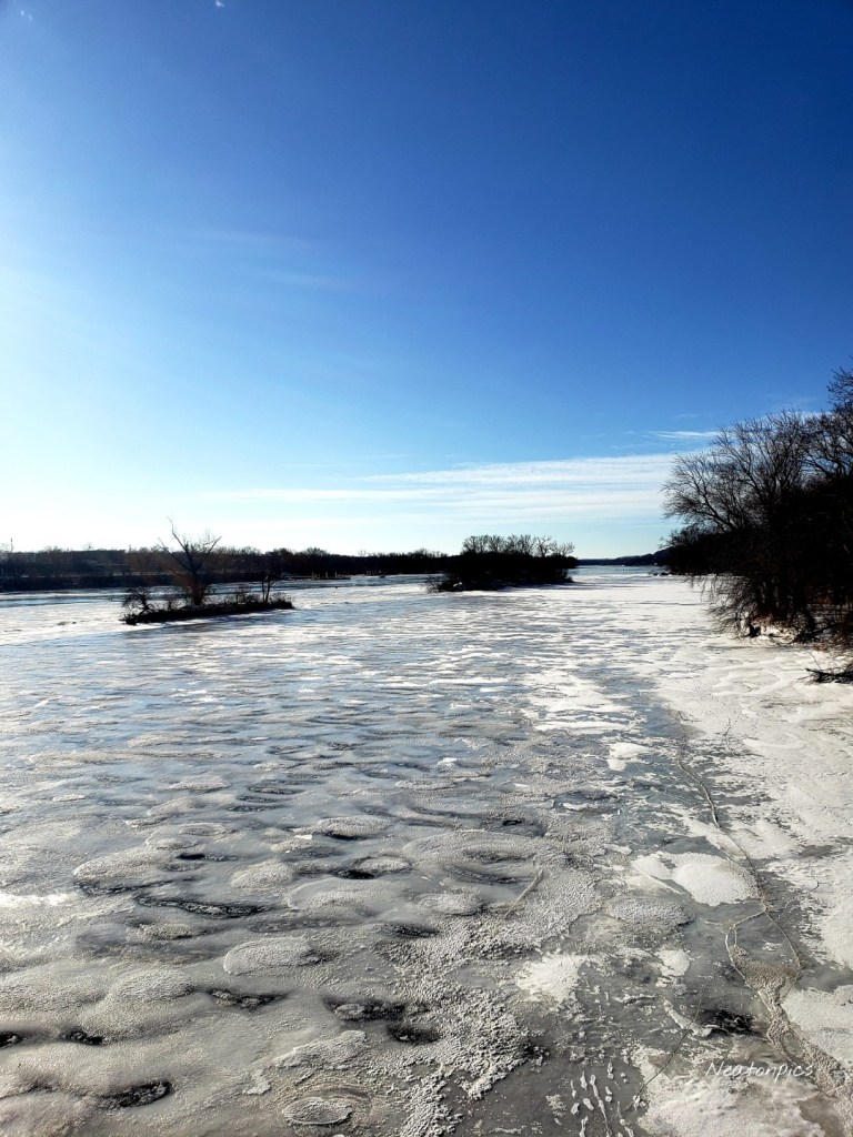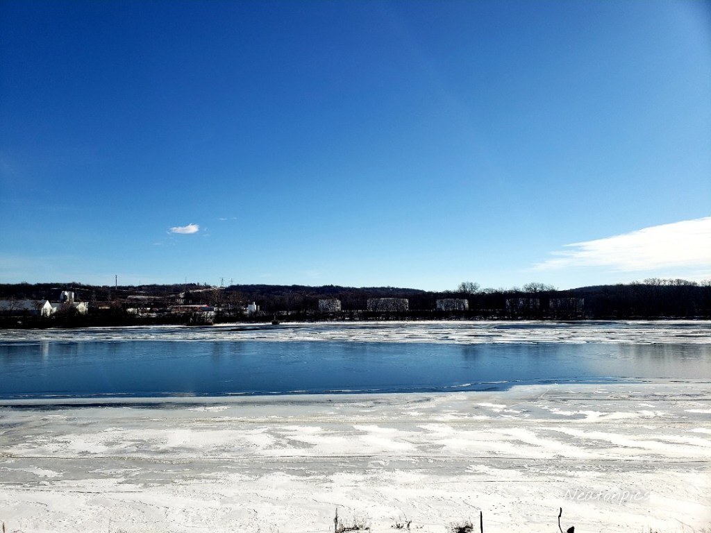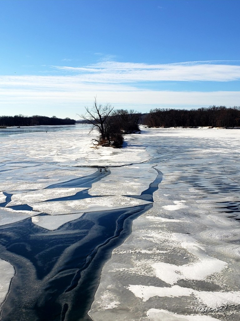 The Mississippi River mirrored the brilliant blue sky as I crossed the Wakota Bridge.