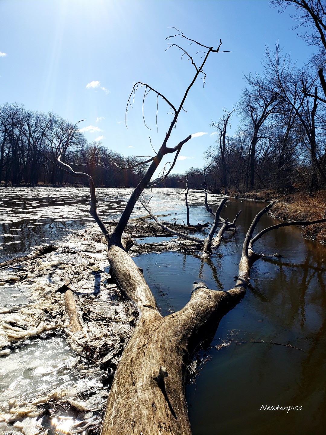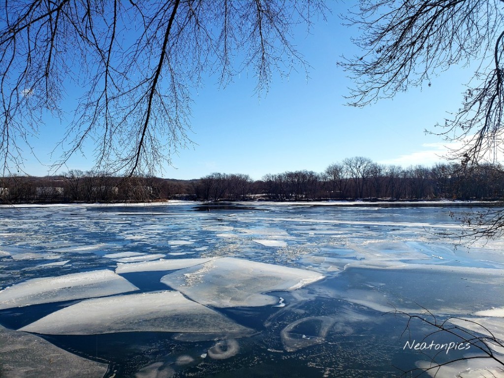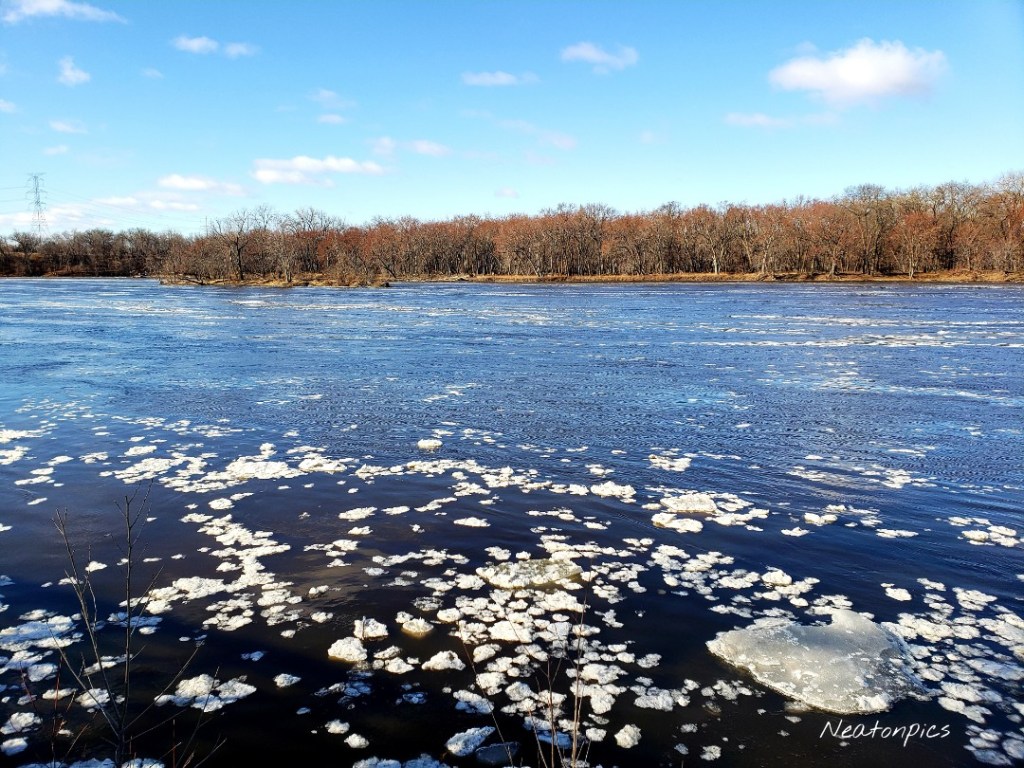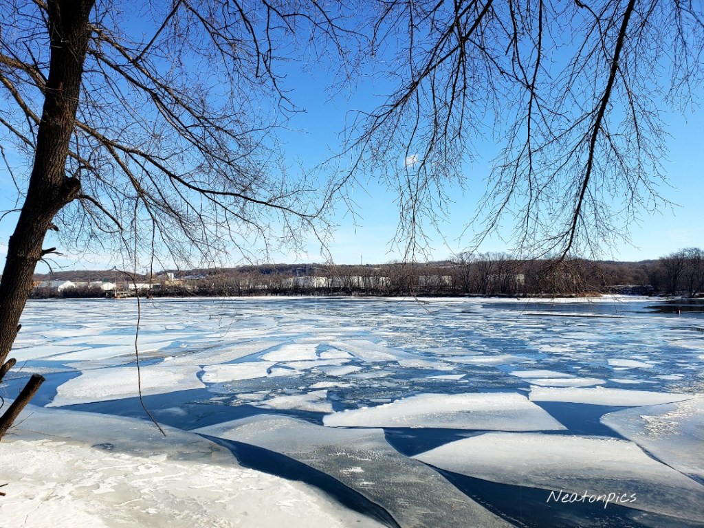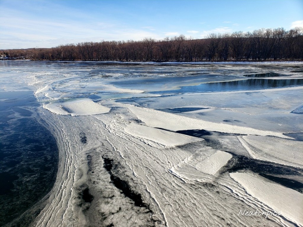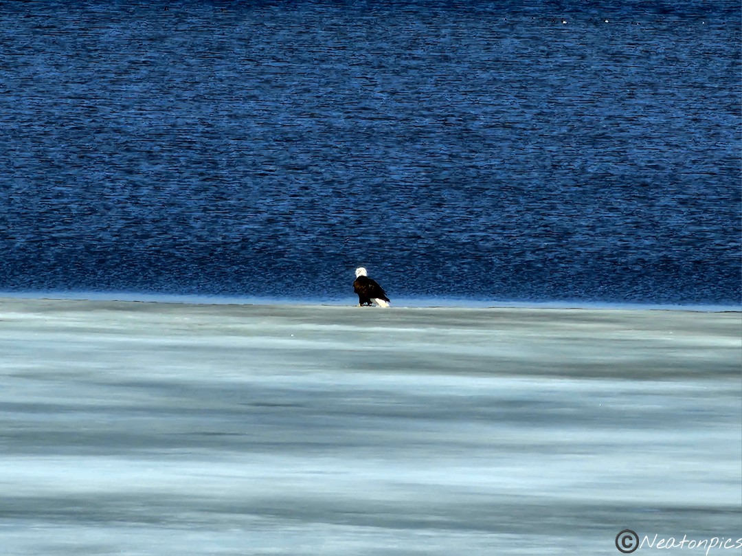 Further away from the shore, the frozen river began to break apart into giant sheets of ice. The warm sun shimmered across the water as eagles soared above looking for their next meal.