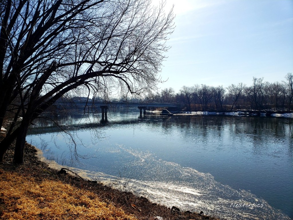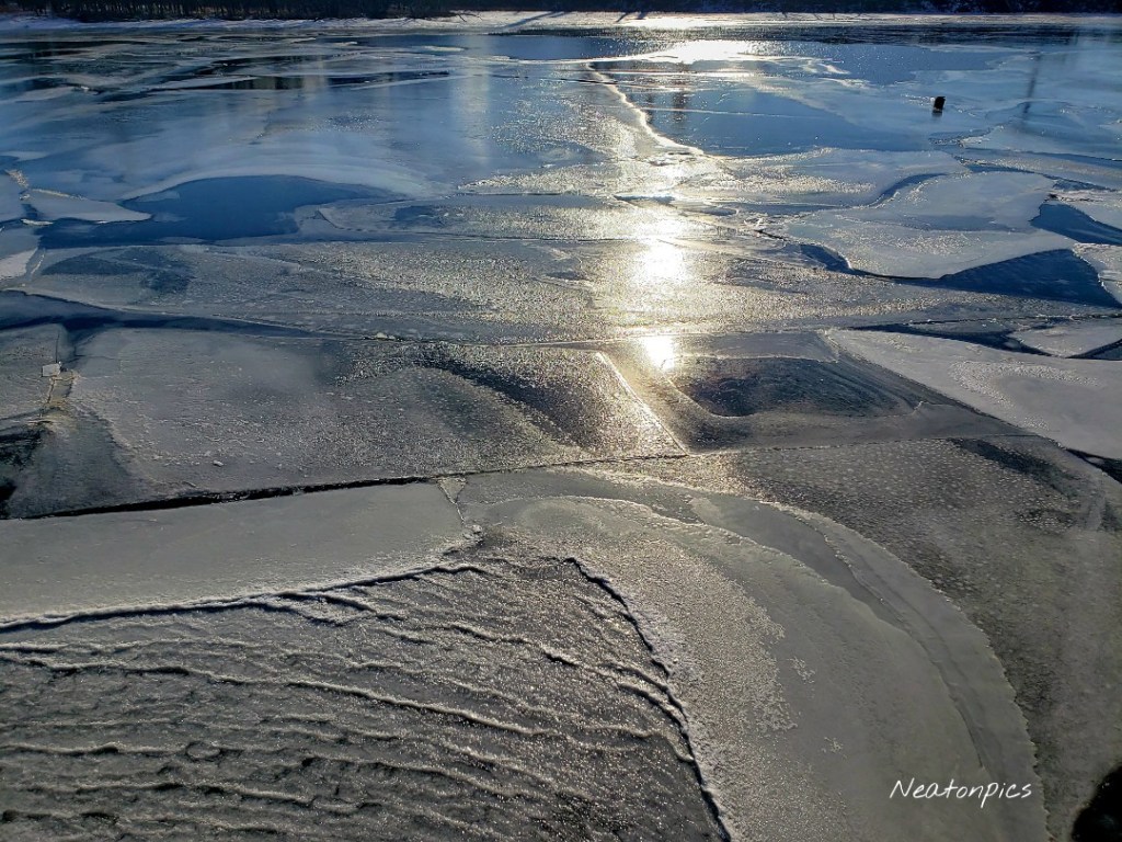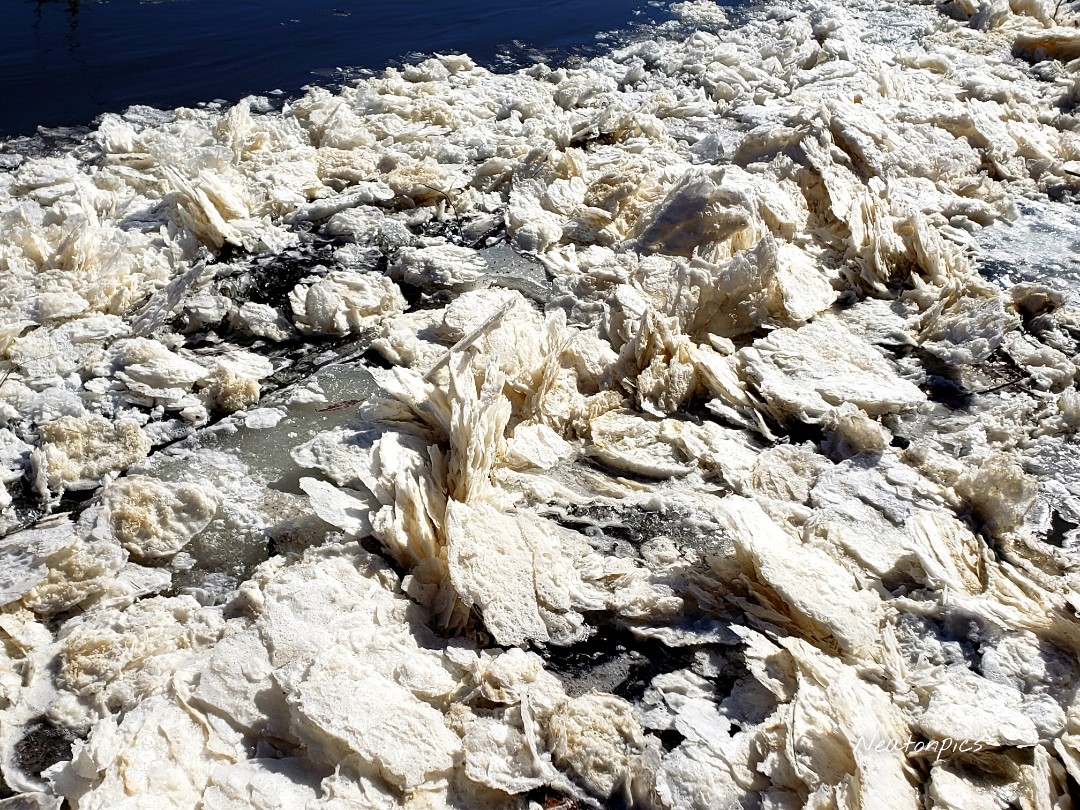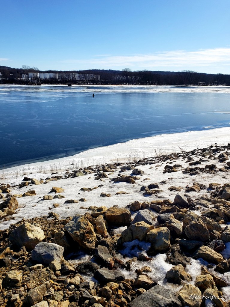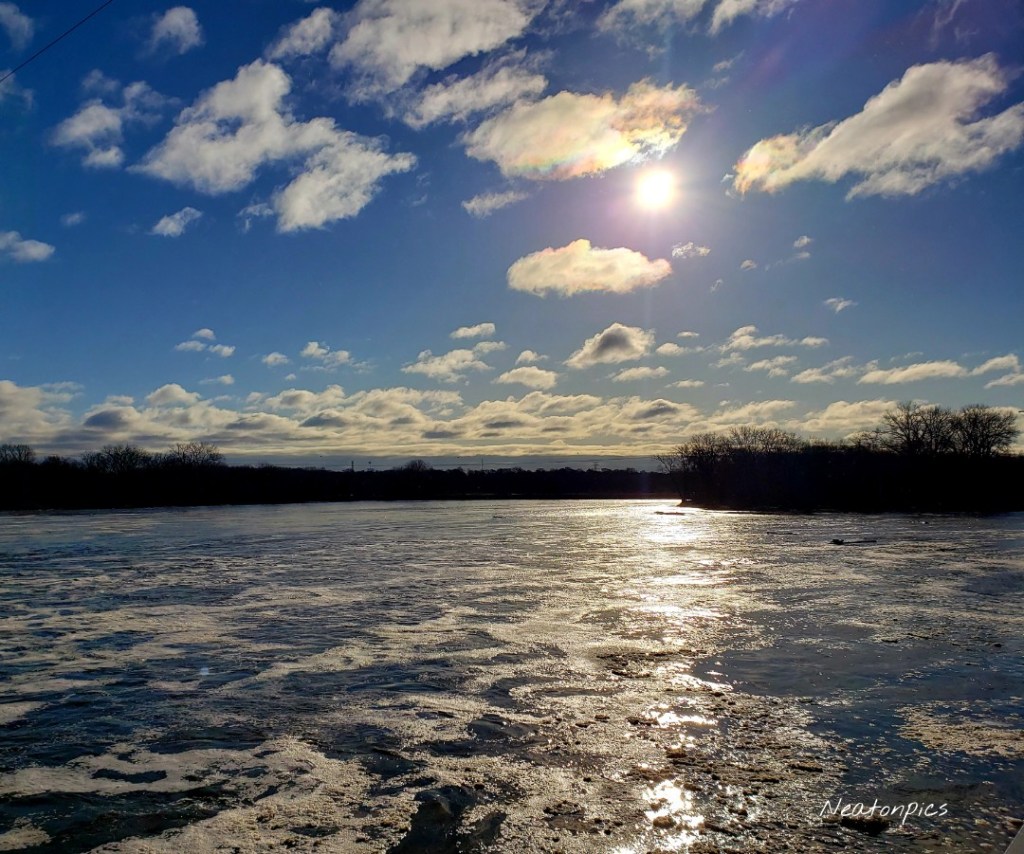 Further away from the shore, the frozen river began to break apart into giant sheets of ice. The warm sun shimmered across the water as eagles soared above looking for their next meal.