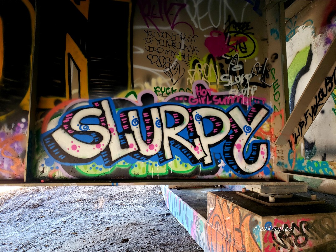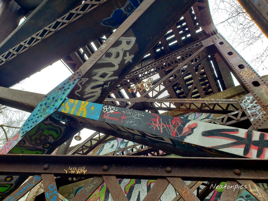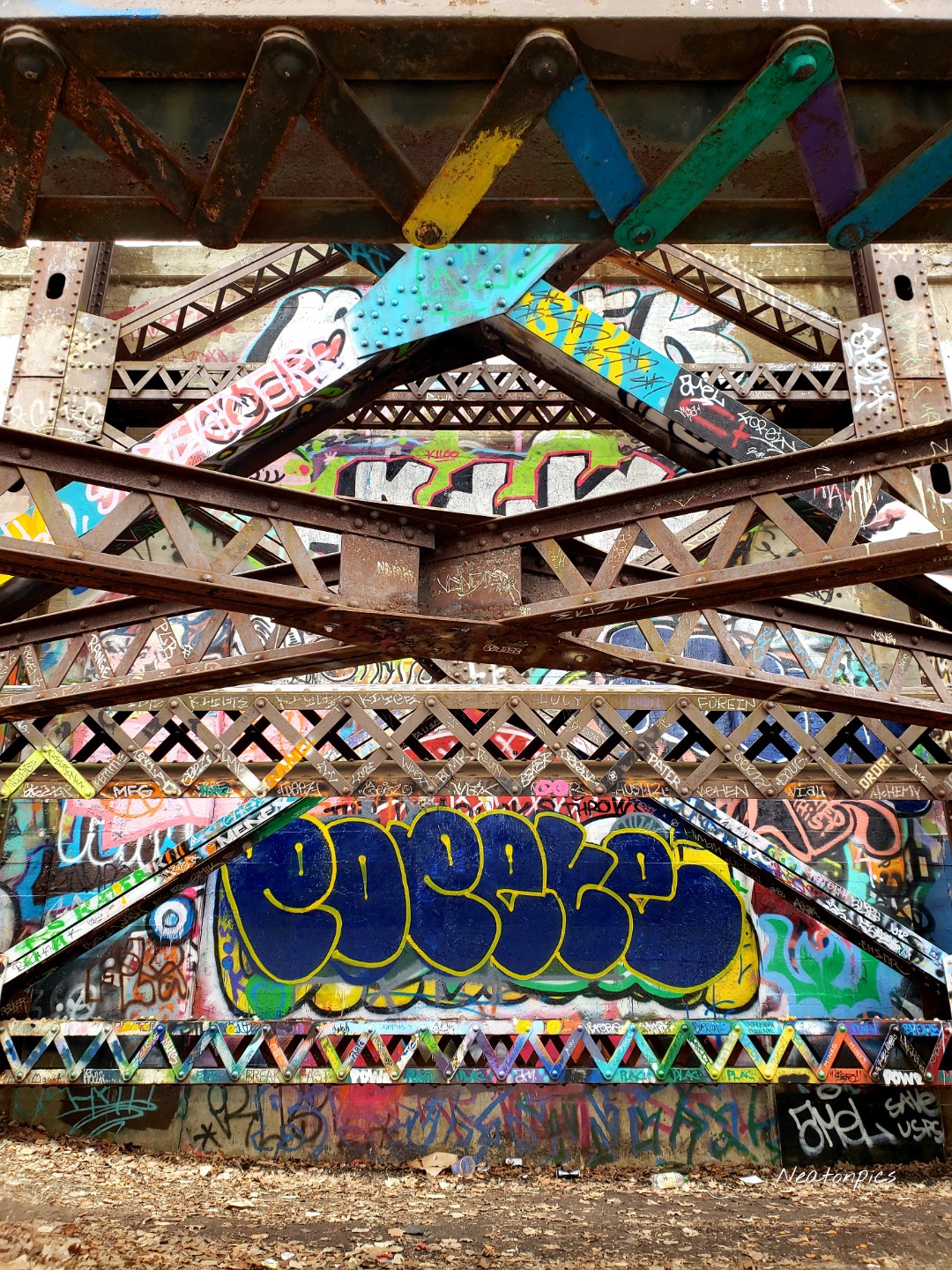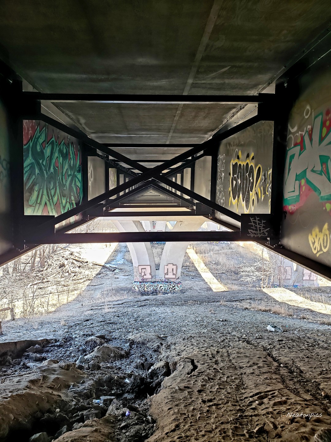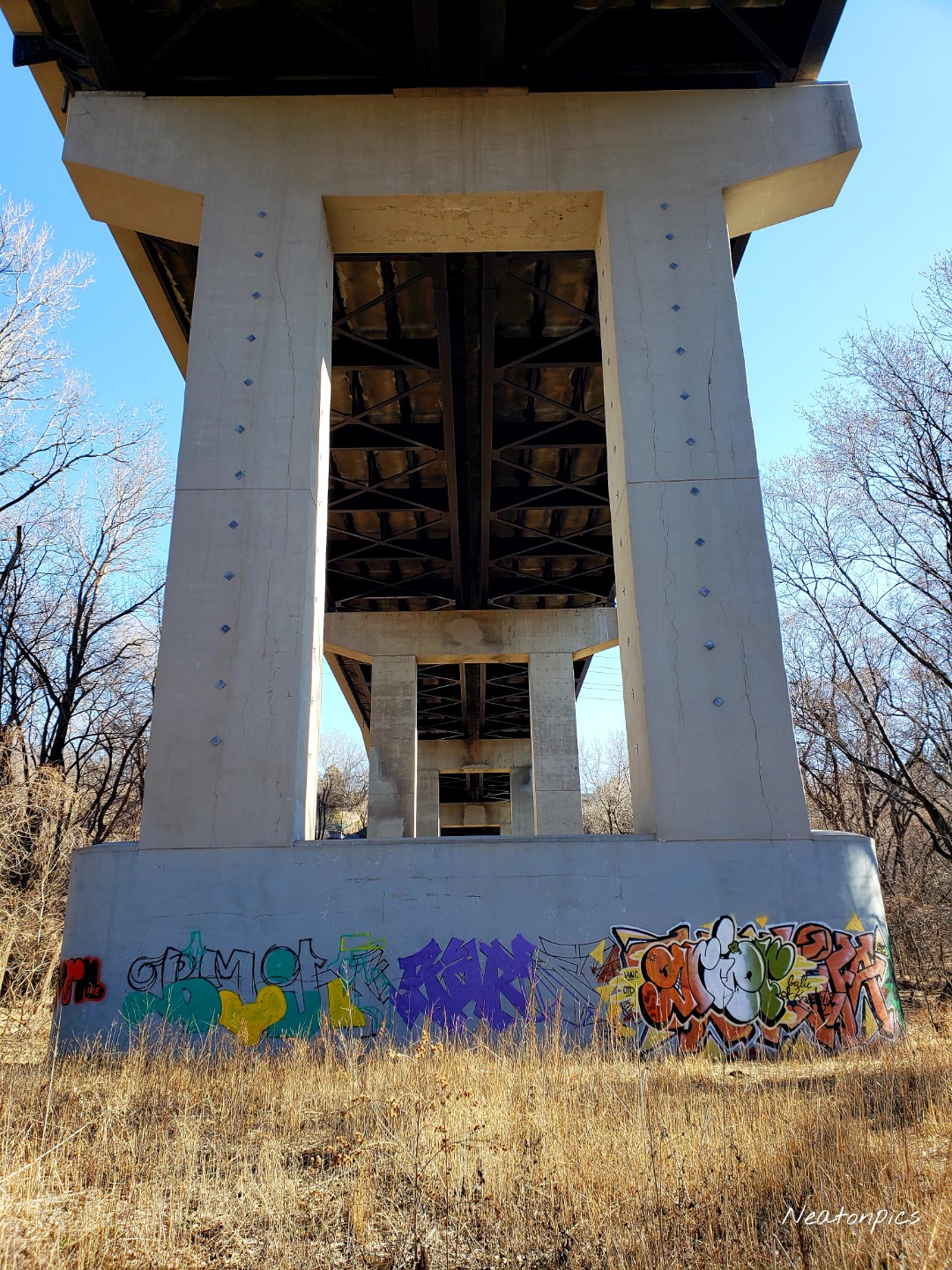 The trail led us to the underside of the 35 E Bridge. We found a cool view of the belly of the bridge and some colorful graffiti.