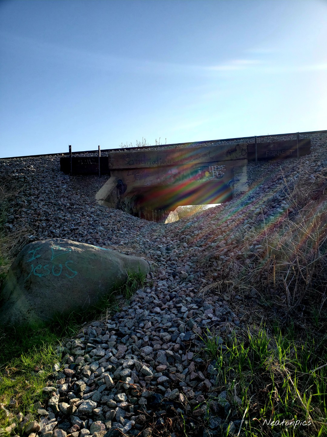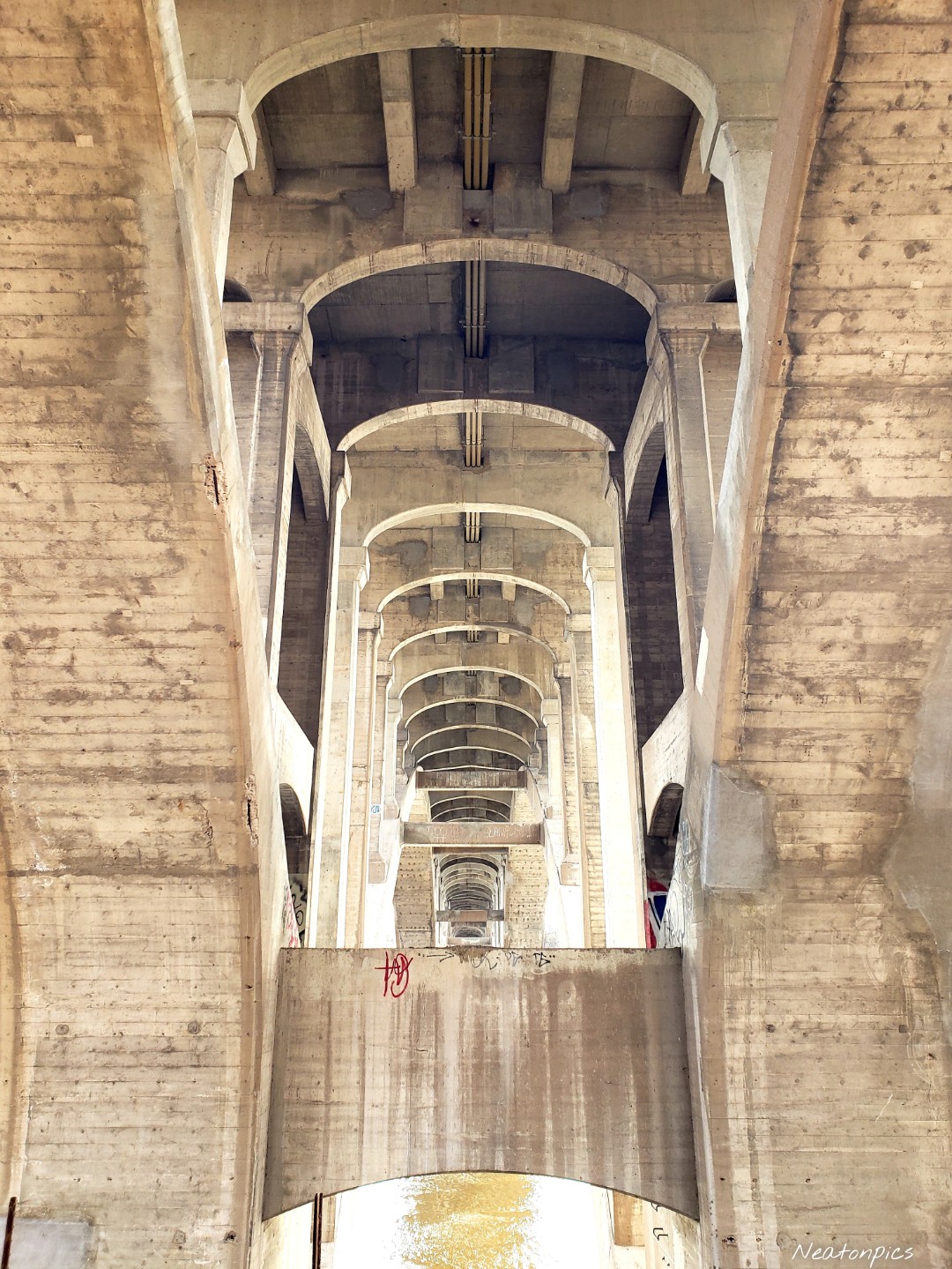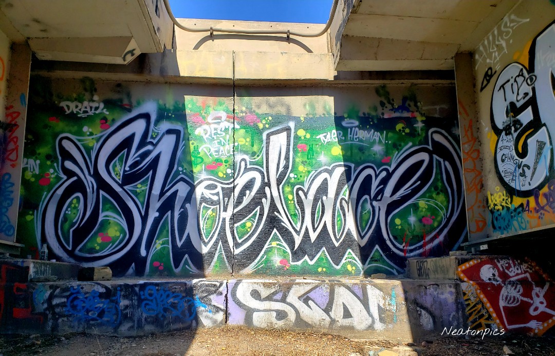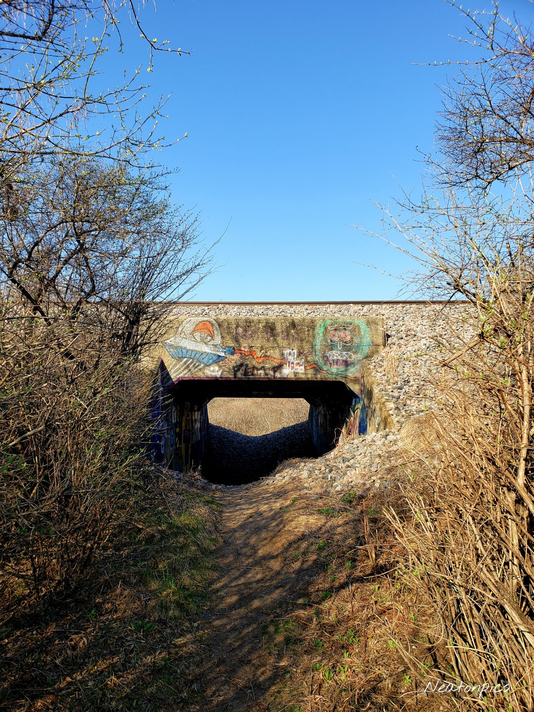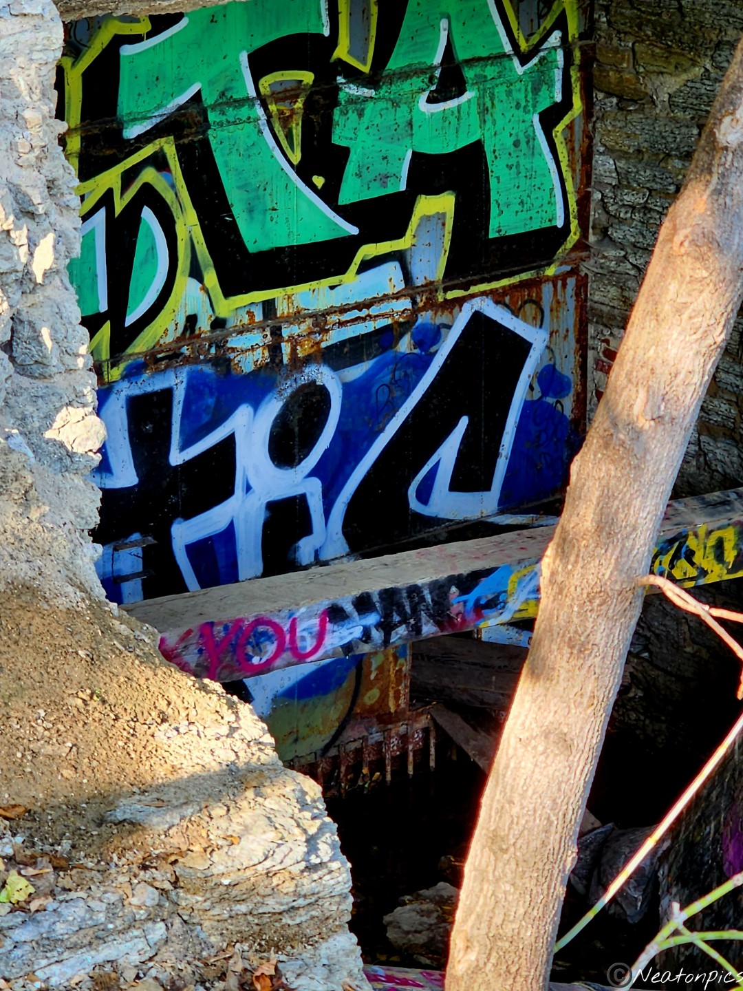 The trail led us to the underside of the 35 E Bridge. We found a cool view of the belly of the bridge and some colorful graffiti.