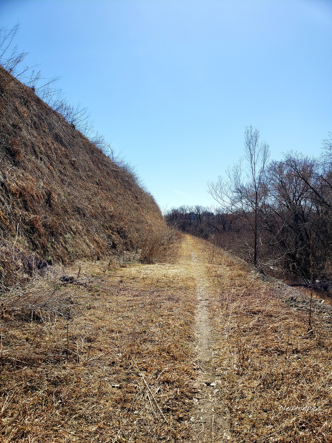 About a mile into our hike on the Mississippi River Regional Trail, the trail closed due to bridge repairs. On our way back to the dam, we looped around the still frozen Cenaiko Lake. Even though it didn’t feel like spring, we could see some green grass beginning to grow.