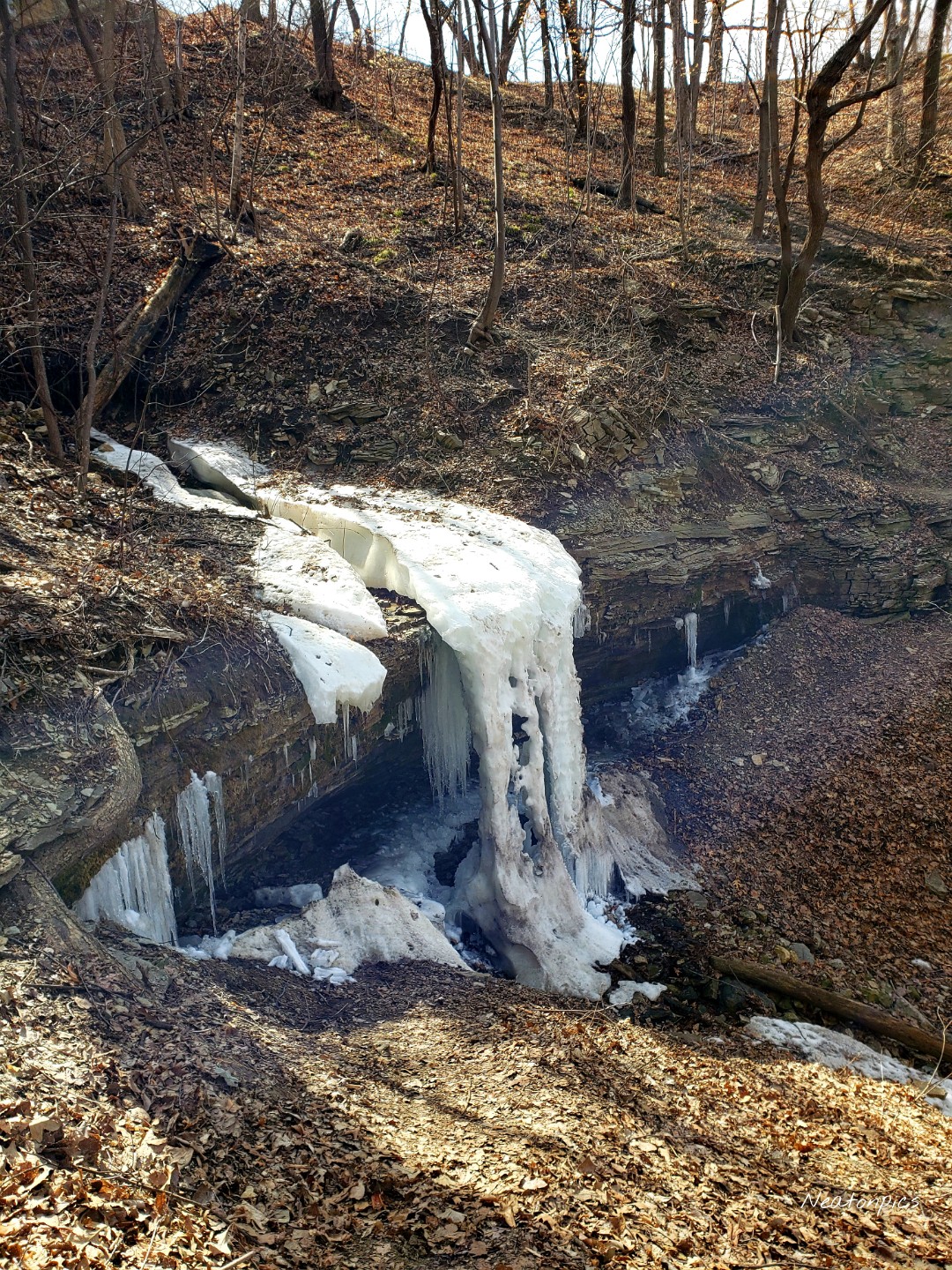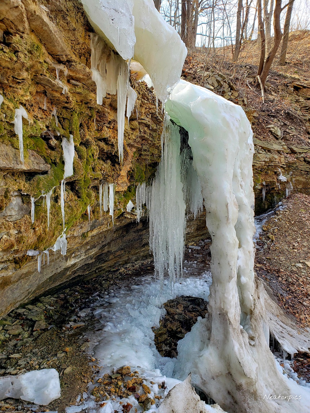 Once on the other side of the Ford Parkway Bridge, we continued our hike along the river trail in St. Paul. We found two waterfalls along the trail. The first waterfall was still frozen.