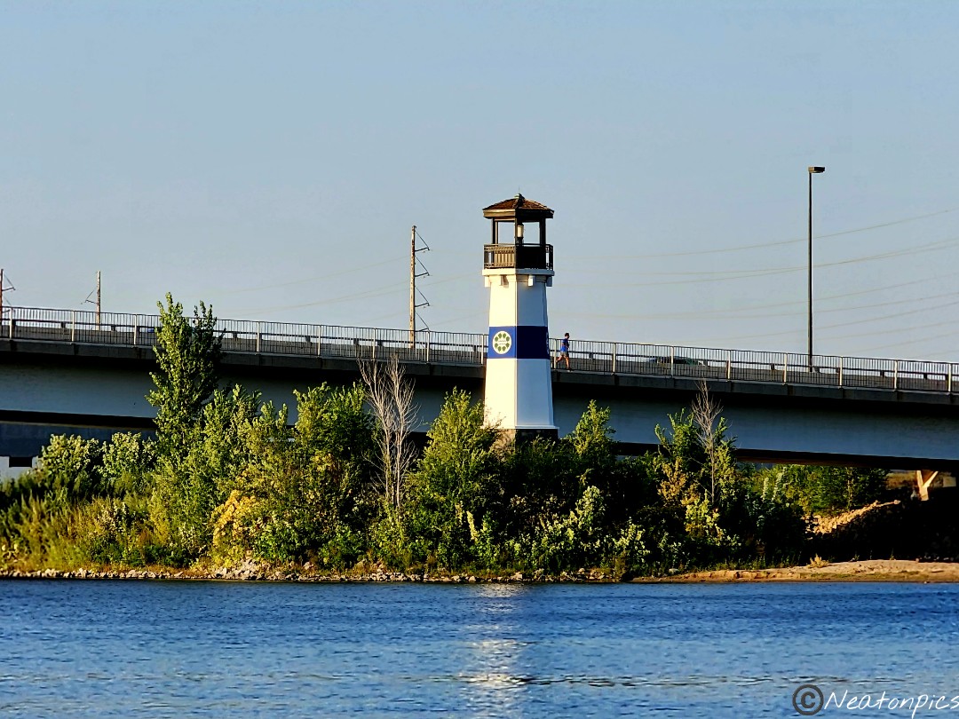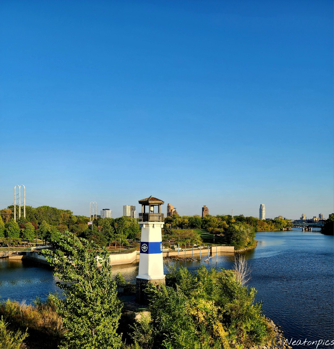 Boom Island Lighthouse with views of the Plymouth Avenue Bridge and Downtown Minneapolis.